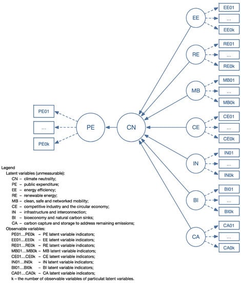 Public expenditures (PE) and climate neutrality (CN) are complex phenomena, which should be defined on the basis of a set of observable variables. The study of dependencies between them requires the application of a proper method, enabling the analysis of directly latent variables as well as their relations. Soft modeling provides such possibilities [44]. The soft model is composed of an internal model (theoretical) and an external model (measures) [44,45,46,47,48,49,50,51]. Those models are simultaneously used in the process of parameter estimation—they are connected with one another. The internal model describes relations between latent variables. In the constructed soft model, two rank I latent variables that construct the internal model were adopted: public expenditures (PE) and climate neutrality (CN). In addition, seven rank II latent variables that define climate neutrality were adopted: energy efficiency (EE); renewable energy (RE); clean, safe, and networked mobility (MB); competitive industry and the circular economy (CE); infrastructure and interconnection (IN), bioeconomy and natural carbon sinks (BI); and carbon capture and storage to address remaining emissions (CA). The theoretical model examines relations between climate neutrality of the EU countries’ economies and public expenditures classified as incurred for environmental protection. As preventing climate changes and adapting to them has been the main common environmental problem of the EU countries for years, investigating dependencies between the obtained results for the purposes of climate neutrality and expenditures incurred for environmental protection by particular countries enables the identification of those expenditures and the efficiency of the policy in this field. It should also be noted that an efficient solution to the problem of CO2 emission will at the same time solve a number of fundamental environmental problems, such as emission of pollutants to air, insufficient recycling level, and depletion of resources. The primary reason for all of them is unsustainable consumption. The study also aims at revealing which of the seven areas (rank II latent variables) defined at the EU level has the greatest impact on the main objectives of climate neutrality. Latent variables were determined on the basis of the aggregated set of observable variables (indicators). The relations between those variables are called the measure model, in other words, the theoretical model. It reveals the way of defining latent variables by a set of indicators.
