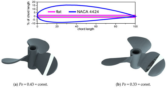 In our previous work [2], it was established that the application of an aerodynamic (airfoil) profile for the propeller blade cross-section reduces the mixing power significantly. Figure 1 presents two of the tested propellers. The use of the NACA4424 airfoil resulted in almost a 25% reduction in mixing power in comparison with the flat cross-section at the same projection area of the blade on a horizontal plane.