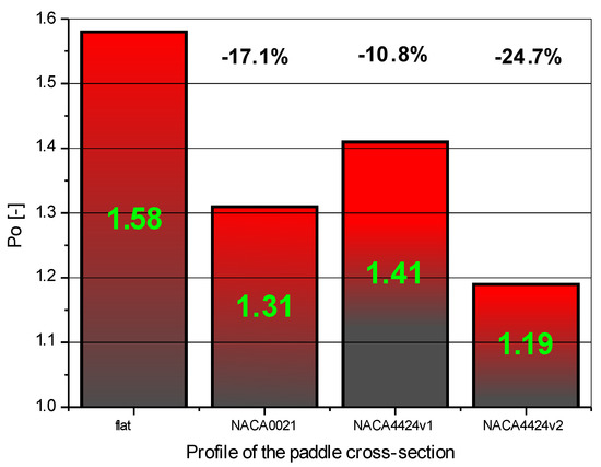 The measurements were carried out for the turbulent mixing range (Rem > 10000 [3,4]) in which the power number Po had a constant value. The obtained values of the power number depending on the blade profile are presented in Figure 6. The values Po were obtained with an error of ±4.2%. The figure also shows the percentage reduction in the mixing power of impellers with a profiled cross-section in relation to standard impeller PBT45-6.