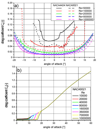Dependence of drag coefficient on the angle of attack [53,54,55]. (a) the drag coefficient of the airfoil NACA0021 for small angles of attack (b) the drag coefficient of the airfoil NACA0021 for high angles of attack.