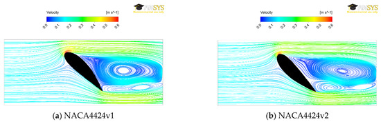 No dependence Cd = f(Re) means that the value of the drag coefficient will not change depending on the distance from the axis of rotation of the impeller This facilitates the analysis of the dependence of the mixing power depending on the aerodynamic profile used, provided that the value of the drag coefficient Cd is known. Due to the lack of information on the values of the drag coefficient for the NACA4424 profile for angles of attack greater than 20°, an attempt was made to determine them based on numerical CFD simulations. This is a rapidly developing branch of computer science, although the results obtained in simulations are still verified experimentally [56,57,58]. The calculations were carried out in the ANSYS CFX program for the channel (dimensions: length Lch = 300 mm, height Hch = 125 mm, width Bch = 10 mm), in which water flowed at the speed Uch = 0.15 m/s. The used profile had a chord length of 100 mm, which gives a Reynolds number value for the flow of around Ref = 15,000. The dimensions of the channel correspond to the channel of the stand for testing the spray detachment angles. The turbulence model was used in the calculations: k—ε. The results obtained for both variants of the NACA4424 profile setting for the angle of attack α = 45° are shown in Figure 8 [59].