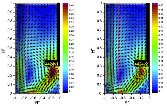 The measurements of axial and radial velocity distributions in a mixing tank with four standard baffles for the PBT45-6 impeller with a flat blade cross-section and for profiled cross-section blades were carried out using the PIV method. The obtained results are presented in Figure 9 in the form of dimensionless contour and vector maps U* = U/Utip = U/(π·D·N) = f(H*, R*) for the rotational frequency N = 240 min−1 (Re = 40,000). The presented graphs show the position of the circulation core, i.e., the point where radial and axial velocities marked as two intersecting red lines are equal to zero.