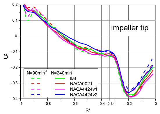 The shapes of individual curves obtained in Figure 10 for the three impellers with NACA profiled blades and for the standard PBT45-6 impeller are similar to each other and coincide to a great extent with the results of other authors obtained for the standard PBT impeller [22,63,64]. It should be noted that the maximum values of axial velocities in the stream of liquid pumped from the impeller zone downwards occur in the half of the radius of the impeller they are included within narrow limits of (0.35 ÷ 0.39)·Utip. The remaining stream of induced circulation also flowing downwards has a much lower velocity, on average about 0.08·Utip, as this stream does not pass through the area of the impeller. The impeller with a rectangular cross-section of the blades, despite higher power consumption (Figure 5), does not show higher axial velocities compared to the impellers with a profiled section, except for the NACA4424v2 impeller. The other two NACA impellers showed even slightly higher axial velocities than the standard PBT45-6 impeller, despite lower mixing powers. This is important because liquid with higher axial velocity has a greater chance of picking up solid particles resting there and suspending them in the liquid core.