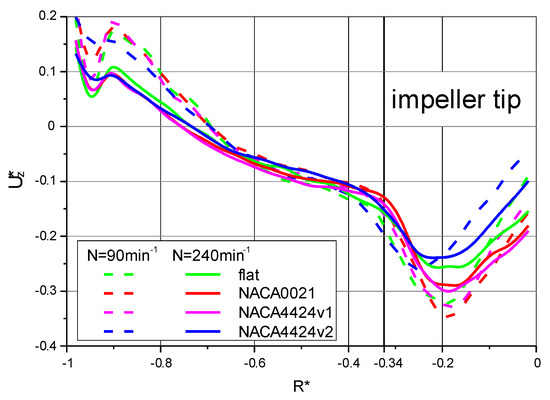 To determine the amount of the secondary circulation Vs, the axial velocity profiles were determined in the mixing tank at the height of the circulation core (Figure 9). The obtained results are shown in Figure 11. Due to the fact that the planes passing through the individual circulation cores are located near the lower edge of the rotating blades of the impeller, the obtained axial velocity distributions in Figure 11 are very similar to the distributions presented in Figure 10. By numerical integration of the distribution presented in Figure 11, it was possible to obtain the value of the entire stream Vs circulating in the plane r–z.