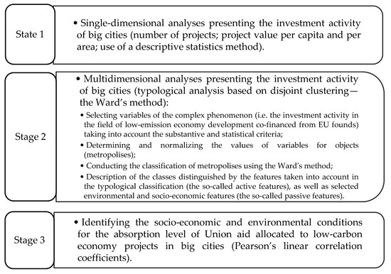 Research on the evaluation of investment activity of the metropolises in terms of obtaining EU funds for a low-carbon economy within the 2014–2020 financial perspective consisted of three stages (Figure 1). The collected empirical data were processed using basic methods of descriptive statistics (1st and 3rd stages of the research) and taxonomic methods (Ward’s method) using Statistica (2nd stage of the research). The first stage of the research discussed the variation in the amount and quality of support obtained by Polish metropolises from EU funds for low-carbon economy purposes (1st stage of the research). To assess the diversity of the scale of investment activity of the metropolises in the low-carbon economy co-financed by EU funds, the second stage of research involved a multidimensional analysis of the studied phenomenon using Ward’s method. Taxonomic analysis allows us to assess the diversity of the studied elements (e.g., cities), described by a set of simple characteristics. It leads to the determination of the clusters of these objects in terms of development similarity, as well as to the acquisition of homogeneous classes of elements due to the properties that characterize them [81]. With this in mind, the multidimensional analysis of the investment activity of metropolises which is co-financed by EU funds was carried out in the following stages: