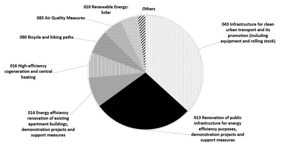 Cities’ low-carbon activities focused on the following economic areas: transport (34%), electricity, gaseous fuels, steam, hot water and air for air conditioning systems (24%), and environment and climate change activities (19%) (Figure 2). Considering the detailed area of support, most activities concerned transport infrastructure and renovation of public infrastructure. The vast majority (69%) of them were implemented under Regional Operational Programmes, i.e., programs dedicated to local governments of a given region. Due to the fact that renewable energy sources investments are characterized by significant capital absorption, the beneficiaries also benefited from the nationwide Operational Programme of Infrastructure and Environment (59 projects). In addition, the cities with powiat statuses located in Eastern Poland (Lublin, Białystok and Rzeszów) were able to implement their activities using funds targeted only at those regions (10 projects). Accordingly, the activities were financed by both the European Regional Development Fund (74%) and the Cohesion Fund (26%). The vast majority of these projects were not completed (64%) (Table 2).
