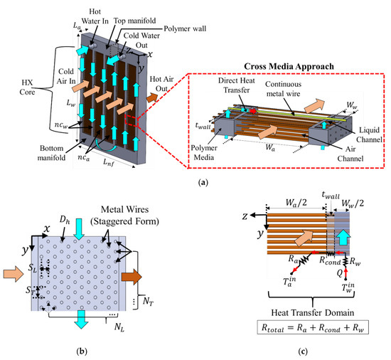 The additively manufactured metal-polymer composite HX [23,24] comprises an HX core made of polymer and an array of metal wires, which act as fins for both air-side and liquid-side convective heat transfer, as shown in Figure 1. Metal wires can be arranged in a staggered or inline configuration. The heat exchanger can also include additively manufactured integrated liquid manifolds of polymer. Customized 3D printing processes utilize a polymer and a metal head based on a hybrid and innovative approach [25] designed and developed by a few of the co-authors, as described in [20,26]. The polymer head prints layers of polymer media to build air-side and liquid-side channels using FDM while the metal head prints bare metal wires that continuously lay over the polymer media using EFCAM such that they form a direct heat transfer route between the air-side and liquid-side channels. These wires transfer heat effectively, despite low thermal conductivity of the polymer structure, as shown in Figure 1. This concept is referred to as the cross-media approach, and HXs are referred to as integrated cross-media HXs (iCMHXs). HXs are additively manufactured in-house using a customized proprietary 3D printer. HXs are then post-processed by dip-coating them in polyurethane sealant to ensure leak-proof polymer–metal interfaces [24]. Post-processed HXs are then tested and modeled for heat transfer between hot and cold fluids.