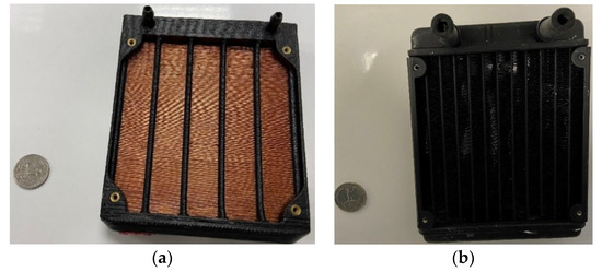 iCMHX is designed to possess similar size and performance as the conventional and standard all-in-one CPU coolers that are typically attached with 120-millimeter standard fans [27,28]. In the current study, iCMHX is compared with one such off-the-shelf conventional unit, an aluminum HX with louver fins on the air side and plain channels on the liquid side, as shown in Figure 2.