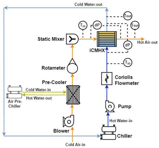 The schematic of the test setup consists of two loops: the air-side loop and the water-side loop, as shown in Figure 3.