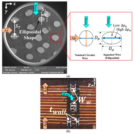 Due to lightweight, low-cost, and anti-corrosive properties of polymers, several polymer HX designs have been developed [2,3,4,5,6]. However, the lower thermal conductivity of polymer of about 0.2–0.6 W/(m·K) [7] yields relatively higher conductive resistance through the HX structure. One method to resolve this issue is by increasing the thermal conductivity of polymer HXs to up to 20 times by using metal fillers [4] or carbon nanotubes [8,9] in the polymer media. However, extensive research is still required to determine the effect of metal fillers and polymers on effective thermal conductivity and anisotropic properties of HXs [10]. Another method to fix this issue is to reduce the polymer’s wall thickness using thin-walled polymer HXs [11,12,13,14], such as crossflow micro-passage HXs [15]. However, such thin structures are limited by manufacturing constraints. Alternatively, recent studies have presented metal-polymer composite HXs such as hybrid polymer HXs [16] and continuous-wire HXs [17,18]. These hybrid polymer HXs consist of copper and polymer helically wound hybrid tubes capable of increasing effective thermal conductivity from 0.1 W/(m·K) to 1 W/(m·K). However, these HXs are constrained in their tube diameter size. Continuous-wire HXs consist of fine metal wires, with diameters as small as 0.105 to 0.25 mm, woven or knitted through plastic walls. They have been compared to pin-fin arrays, which have been reported to deliver the same performance as conventional louvered fin HXs but at 22% less volume [19]. However, these HXs suffer from wire-curvature issues and lack a robust fabrication procedure.