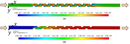 For thermal performance, Nusselt numbers for both fluids are obtained using the Eff-NTU method as detailed in [23]. Typical velocity and temperature contour plots at some given flow rate for the air-side domain are shown in Figure 6.