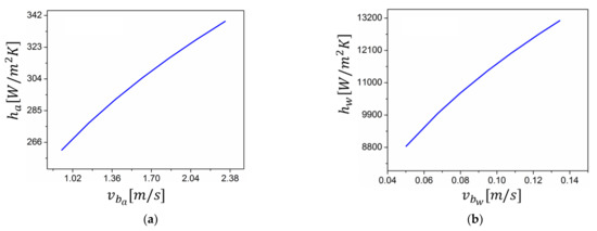 Convective heat transfer coefficients obtained from 3D CFD based on Equation (12) for (a) air side and (b) water side.