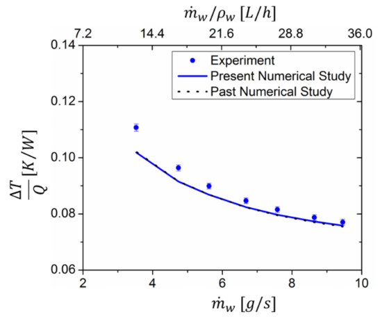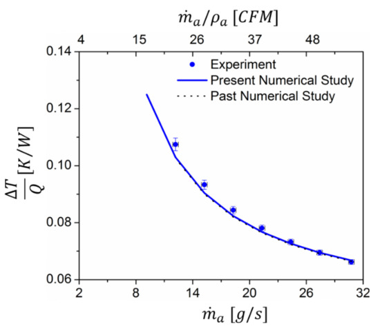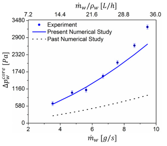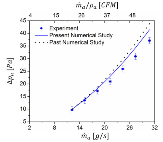 This section validates the numerical study using experimental results for both water-side and air-side testing. The present numerical study is further compared with the authors’ past numerical work [23,24].