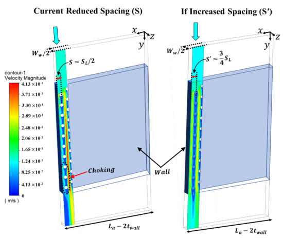 This is performed by assuming uniform fluid flow and temperature profile across all water inlets. As shown, the water-side domain is first reduced from a single water channel to a single symmetrically half water channel consisting of dimensions. The 3D domain, however, can be further reduced along and dimensions. A symmetric flow field is expected along the y-direction for given flow ranges (30 < Rew < 80, see nomenclature), as similarly observed in the literature [38]. Thus, dimensions, including wires, can be reduced to a symmetric domain consisting of two consecutive wires in the -direction distance apart. The effect of the wall boundary in the x-direction is modeled separately by using similar domain and boundary conditions. For the dimension, the computational domain in the y-direction can be reduced by using at least 20 wires, as the equivalent number of wires in the longitudinal direction to waterflow (2) is too large. These equivalent wires are defined based on longitudinal spacing between the wires (ST/2) along the waterflow direction. Since the water channels are too narrow, the ratio of width of the water-channel (Ww) to transverse spacing between the wires (2SL) is much less than 5; therefore, the velocity component and gradients of the velocity field of the water flow in the z direction cannot be neglected, as explained in the literature [17]. Thus, the wall boundary condition on the polymer wall must be modeled.
