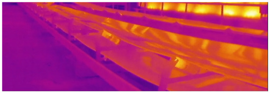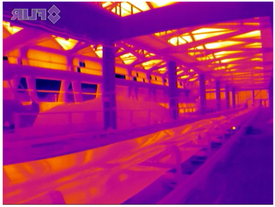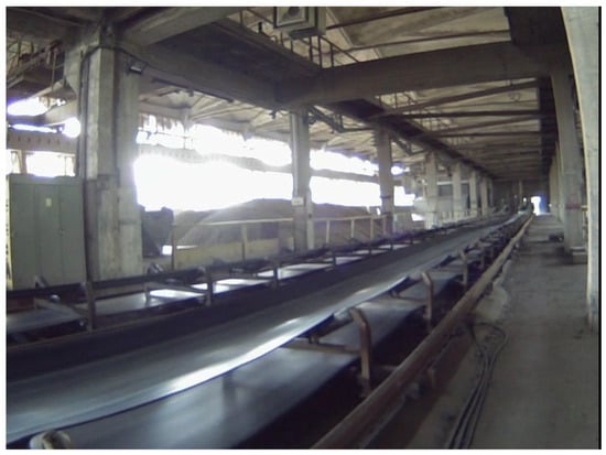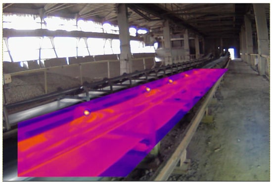 An experiment carried out in the mine resulted in the collection of diagnostic data acquired by the UGV inspection robot developed under Autonomous Monitoring and Control System for Mining Plants (AMICOS) project [47]. Various types of data were recorded (RGB images, infrared thermography images, noise, lidar data, etc.) for the purposes of various diagnostic tasks. Figure 3 shows a frame from the captured movie of a conveyor in the hall, the next Figure 4 shows an analogous view but recorded with an infrared camera.