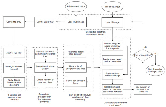 The method proposed in this paper is based on solutions that operate on two different, timewise synchronized datasets: RGB and IR images. The first solution consists of searching of a decreased region of interest (ROI) to minimize the number of potential artifacts, while the second part is focused solely on the thermal detection of damaged idlers. There are many available techniques to filter the image (image smoothing or edge filtering). A probabilistic Hough transform is popular in image analysis applications. It has been proposed here to crop out from the image exact area occupied by belt conveyor. This area is detected taking advantage of the fact that the outer edges of the belt can be simplified to straight lines.