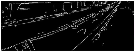 For the RHT algorithm to work correctly, several steps had to be taken before its implementation. Firstly, images were converted to gray scale and smoothed by Gaussian filter in order to remove part of the noise related to the used equipment and the quality of registered data. Then, a Canny filter was applied, as it gave better results than other filters in regard of lines continuity and noise influence. Similar conclusions in terms of filter performance were drawn in [49,50]. An example of an applied Canny filter is shown in Figure 6. The image can be dilated afterwards, as increased line continuity allows for better results from Hough transform.