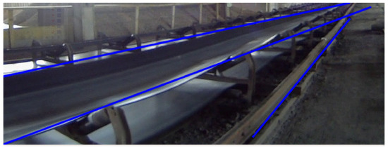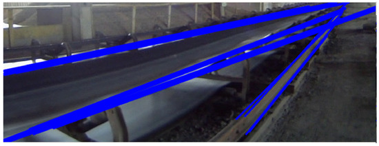 In case of the collected data, horizontal and nearly horizontal lines were removed, as they could not describe belt conveyor due to the camera angle. The next step consisted of grouping and merging of the lines in close vicinity (based on the m and parameter of a general line equation). It should be noted that vertical lines should be also removed (if detected). Results of the preliminary selection and grouping can be seen in Figure 8.