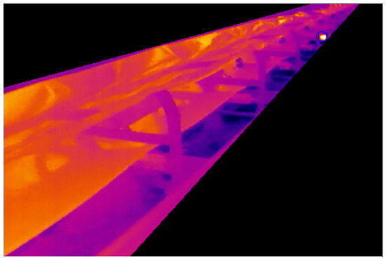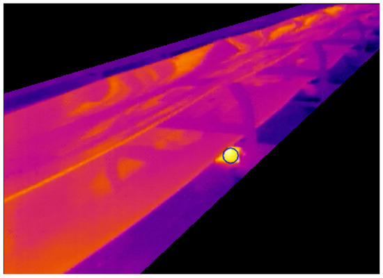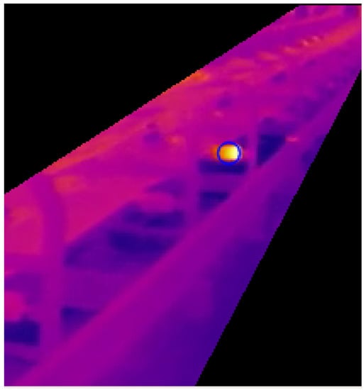 Then, the mask is applied on the IR image, creating an even smaller ROI. It limits the risk of false hot spot detection coming from the background, such as either working machines or materials prone to heating from different sources (heat transfer or exposure to sunlight). The result of a narrowed frame with the applied mask is presented in Figure 11.