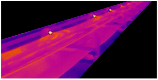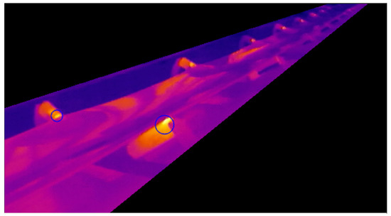 The difference between this situation and similar instances present through the rest of the video comes from the temperature of idlers that remained indistinguishable from the temperature of the belt surface. It resulted in an increased number of both false detections and potentially missed damaged idlers. An example of a case where detection works properly despite the increased belt temperature can be seen in Figure 21.