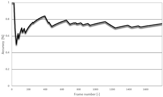 Accuracy can be therefore described as the ratio between the number of correct assessments and the number of computed frames. The accuracy of the detection performed on the selected dataset totaled at 0.78 after 1800 computed frames.