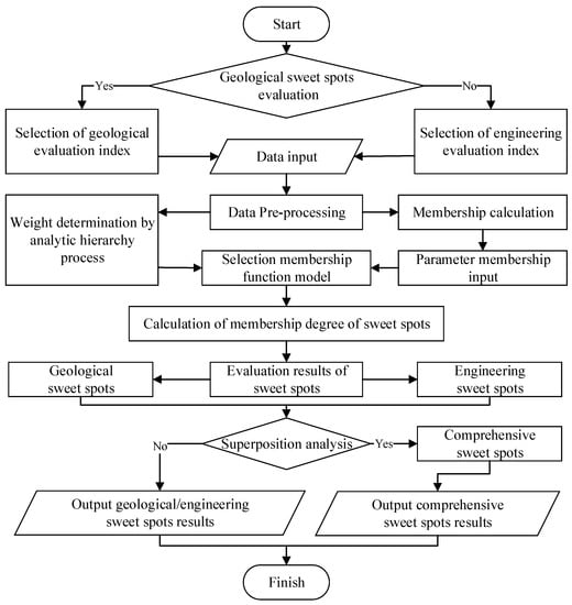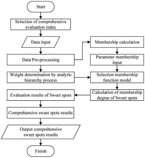 In the first step, the indices used to evaluate GSS and ESS are selected as the parameters for comprehensive sweet spots evaluation, the indices are input, and the data preprocessed. In the second step, the membership of the selected indices is calculated using the membership model. In the third step, the relative weight of each index is determined by analytic hierarchy process, and the appropriate membership function model is selected. In the fourth step, the membership degree of each parameter and the relative weight of each parameter are jointly calculated to obtain the membership degree of the comprehensive sweet spots. Finally, different membership evaluation principles are selected to comprehensively evaluate the membership of CSS, and the evaluation results of CSS are obtained and outputted.