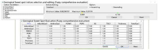 Based on the in-house development software platform that combines geology and engineering indices, the algorithm proposed in this paper is realized. The interface of evaluation parameter selection, segmented interval setting and parameter weight design are shown in Figure 5.