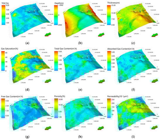Three-dimensional evaluation index model of geological sweet spots in the study area: (a) organic matter abundance (TOC); (b) reservoir formation thickness; (c) reservoir burial depth; (d) gas saturation; (e) total gas content; (f) adsorbed gas content; (g) free gas content; (h) porosity; (i) matrix permeability (models visualized by Schlumberger Petrel software).