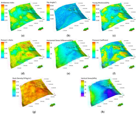 Three-dimensional evaluation index model of engineering sweet spots in the study area: (a) brittleness index; (b) formation dip angle; (c) Young modulus; (d) Poisson’s ratio; (e) horizontal stress difference; (f) pressure coefficient; (g) rock density; (h) vertical stress (models visualized by Schlumberger Petrel software).