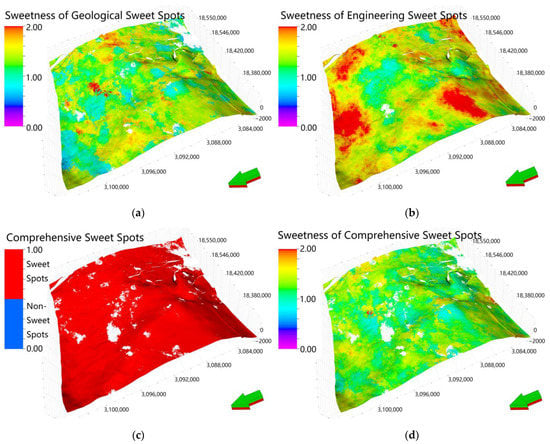 Evaluation results of geological sweet spots, engineering sweet spots and comprehensive sweet spots in the study area: (a) sweetness of 3D geological sweet spots based on evaluation indexes of geological sweet spots; (b) sweetness of 3D engineering sweet spots based on evaluation indexes of engineering sweet spots; (c) evaluation results of 3D comprehensive sweet spots based on the combination of geological sweet spots and engineering sweet spots; (d) sweetness of 3D comprehensive sweet spots directly based on the evaluation indexes of geological sweet spots and engineering sweet spots (only the sweet spots area is reserved, models visualized by Schlumberger Petrel software).