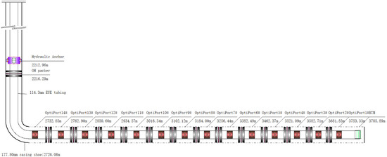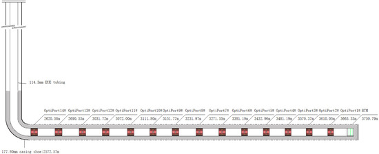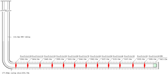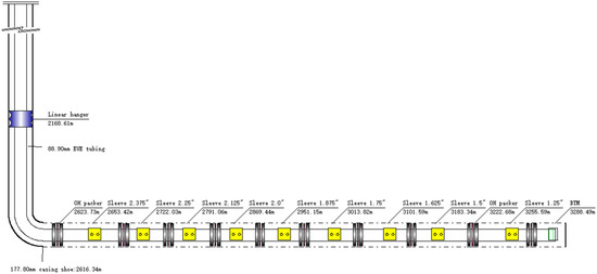 Infinite cementing sliding sleeve multistage fracturing is another form of infinite sliding sleeve multi-frac technology, and its principle, process, and parameters are basically the same as OH packer and infinite sliding sleeve multistage fracturing [51,52]. For this technology, infinite sliding sleeves are installed and run with the casing string to complete cementing operation. It differs from the OH packer and infinite sliding sleeve multistage fracturing in that the intervals are isolated by consolidated cement before multistage fracturing is carried out, as shown in Figure 5.