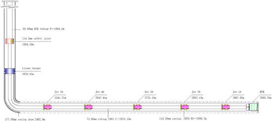 The number of stages in infinite sliding sleeve multistage fracturing is not limited by the process [48,50] by adopting same size balls and ball-seats for all zones. This technique can considerably lessen frictional forces and facilitates a more effective operation, in addition to realizing an inside diameter (ID) extremely close to the host tubular string; therefore, a much lower surface fracturing pressure can be used [48]. Due to the use of CT, it is convenient and easy to flow back after fracturing. Moreover, CT can be used to monitor the bottomhole pressure in real time, which is conducive to the timely detection of the risk of sand plugging. A sandblasting perforator is also integrated in the switch tool of the sliding sleeves, which can be used as a preventive measure; that is, once the formation cannot be fractured, the sandblasting perforation can be used as a remedial measure, and the displacement fluid at the interval is the preflush in the next interval, which reduces the use of fracturing fluid. However, this technology requires high isolation performance of the packers in the string, and it may suffer a risk that the production casing cannot be run to the design position, resulting in misalignment of the fracturing sliding sleeves with the corresponding fracturing intervals.