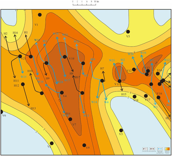 Block M was put into production in March 2014, predominantly by horizontal wells (contributing more than 90% of the total output). Trial production has been carried out in H8, S1, and BX, while horizontal wells are mainly used to develop S2. The S2 reservoir has a good continuity, connectivity, and stable distribution. The buried depth is 2330 m, the average formation pressure is 20.53 MPa, the reservoir temperature is 67.6 °C, the reservoir thickness is 5–25 m, and the average effective thickness is 9.9 m. The porosity is 3.0–12.4%, with an average of 6.8% and a median range of 4–10%. The permeability ranges from 0.1 to 1.2 × 10−3 μm2, with an average of 0.47 × 10−3 μm2. The clay is mainly composed of kaolinite/illite (K/I), with a high content of kaolinite. The microseismic results show that the fractures mainly strike between 75° and 90°. The interpretation results of the dipole array acoustic logging infer that the direction of the maximum principal stress of the formation is nearly NE–SW, which is basically consistent with the microseismic results. According to logging calculation, the Young’s modulus is 2.0–2.8 × 104 MPa, the Poisson’s ratio is 0.15–0.22, and the fracture pressure gradient and closure pressure gradient are 0.018–0.022 MPa/m.