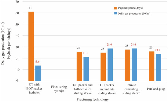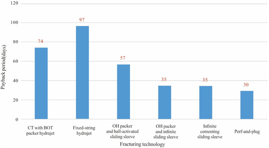 To evaluate the economics of each fracturing technology, the average payback periods for fracturing technologies were calculated according to the actual completion fracturing costs and cumulative gas productions of wells. The results are shown in Figure 9.