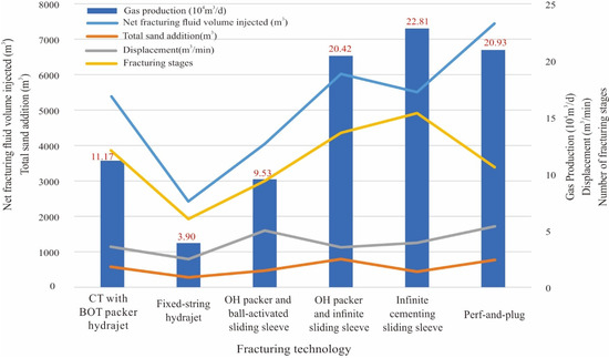 As seen from Table 3, the net fracturing fluid volume injected was 1896.0–8698.0 m3, the displacement was 2.5–7.5 m3/min, the number of fracturing stages was 5–16, and the total sand addition was 188.5–960.3 m3, suggesting greatly variable ranges for different horizontal wells. It can be inferred that the parameters were similar for the same fracturing technology, but different among fracturing processes. As shown in Table 4, the scales of perf-and-plug multistage fracturing and infinite sliding sleeve multistage fracturing (infinite cementing sleeve and OH packer and infinite sliding sleeve) were large, while the displacement, total sand addition, and total fracturing fluid volume injected of fixed-string hydra-jet multistage fracturing were significantly lower than those of other technologies.