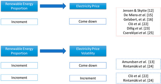 In most of the research works, evidence is observed of the effect that the proportion of renewable energies have on volatility and the price of electrical energy. This research focuses on the correlation that exists between the price of electricity and the proportion of renewable energies. Almost all the evidence indicates that there is a negative correlation between the share of renewable energy and the price of electricity (Jensen and Skytte [12]; De Miera et al. [15]; Gelabert, et al. [16]; Clò et al. [22]; Dillig et al. [23]; Csereklyei et al. [25]). However, these studies were carried out in countries outside of Latin America, so this study aims to fill the research gap on this issue in this region.