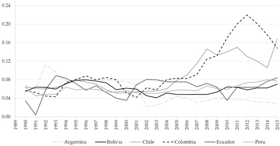 The average annual price of electricity in the industrial sector in the countries of interest at the beginning of the period and until 2015 (with some fluctuations) has remained below 0.12 US$/kWh, with the exception of Chile and Colombia, which from 2004 and 2006, respectively, show a significant upward trend. In the initial period, Ecuador’s tariff is the lowest compared to the rest of the countries; and, at the end of the period, Chile together with Colombia had the highest tariffs in relation to the remaining countries. The cumulative average annual growth rate of tariffs in Chile and Colombia are similar, equivalent to 3.9%, which is higher than the cumulative average annual growth rate of prices in Ecuador (3.6%), Bolivia (1.0%), Peru (0.8%) and Argentina (−3.3%) (Figure 2).