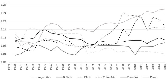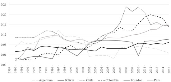 During the analysis period, the average prices in Bolivia, Chile, Colombia, Ecuador, and Peru show an increasing trend in the residential sector, whereas, in the case of Argentina, the behavior tends to be slightly decreasing with a cumulative average annual rate of −1.7%. Peru is the country that experienced the highest cumulative average annual rate (8.8%) in the residential sector tariff during the period 1990–2015, followed by Ecuador (7.1%), Colombia (7.0%), Bolivia (2.2%), and Chile (1.1%). In particular, Chile reached its highest rate (0.23 US$/kWh) in 2008 and 2010, and Colombia in 2012 (0.20 US$/kWh); regarding the rest of the countries, average prices fluctuated below 0.16 US$/kWh, throughout the period of interest (Figure 3).