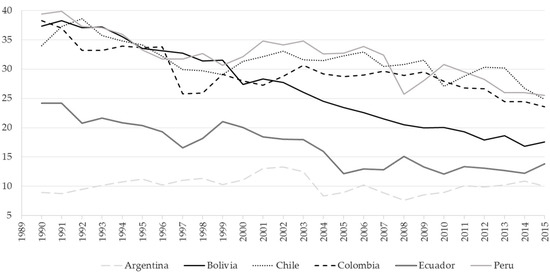 In the period of interest, a decreasing trend in renewable energy consumption (REC) is observed in almost all countries, with the exception of Argentina, which shows a slight upward trend. In the initial period, Peru, Colombia, Bolivia and Chile had the highest REC percentage compared to Ecuador and Argentina. By 2015, the REC percentage had decreased in most countries. Bolivia shows the most significant reduction, equivalent to a cumulative average annual rate of −3.0%, compared to the cumulative average annual growth rate of Chile (−1.2%), Colombia (−1.9%), Peru (−1.7%) and Ecuador (−2.2%).