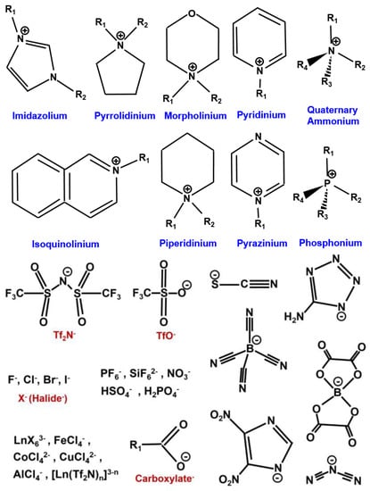 The ILs most investigated so far include various substitutions of imidazolium, pyridinium, ammonium, and phosphonium cations (Figure 1) associated with anions, such as halides, tetrafluoroborate [BF4]−, hexafluorophosphate [PF6]−, bis(trifluoromethylsulfonyl)imide [Tf2N]−, carboxylates [RCO2]−, alkyl sulfates [CnSO4]−, and alkyl sulfonates [CnSO3]−. Due to their complexity compared to traditional solvents, the high cost of ILs is one of the hurdles preventing large-scale applications [,] (Table 1).