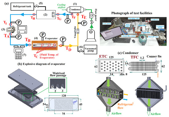 The experimental facilities are illustrated by Figure 1a in which the pumped thermosyphon loop and the configurations of ETC, TFC, and evaporator are depicted. Along with the schematics of test facilities, the photo depiction of the experimental setup and equipment is also included in Figure 1. The horizontal thermosyphon loop was composed by (1) condenser (ETC or TFC), (2) saturated liquid reservoir, (3) Fluid-O-Tech MG213 magnetically driven gear pump, and (4) evaporator. The entire thermosyphon loop was wrapped by thermal insulation layers to minimize the external heat loss. The total heating power fed to the evaporator was mostly transferred by the airflow through the condenser.