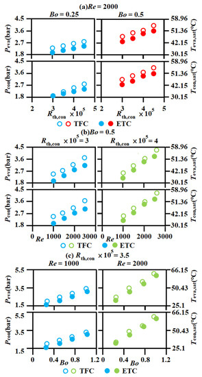 Prior to comparing the various thermal performance indices between the two thermosyphon loops with TFC and ETC, the variations of Peva,con and Teva,con,sat against (a) Rth,con at Re = 2000 (b) Re at Bo = 0.5 (c) Bo at Rth,con = 3.5 × 10−5 for the two thermosyphon loops shown by Figure 2 are examined to exemplify the influences of Rth,con, Re, and Bo on the saturated pressures and temperatures in evaporator and condenser. For providing a clear view of comparison between the loops with TFC and ETC, the data ranges for constructing the plots in Figure 2 are different. In each plot of Figure 2, all the Peva,con and hence Teva,con,sat are increased along with Rth,con, Bo, or Re when the other two parameters remain fixed. As illustrated in previous section, the increase of Rth,con is achieved by reducing the cooling airflow rate that raises the operating temperatures along the entire loop. When the working fluid is undergoing the phase change heating (cooling) process in the evaporator (condenser), the elevated temperature has led to the attendant increase of saturated pressure. By way of Re increase to augment the flow resistance along each thermosyphon loop, the driven pressure head of the pump is accordingly increased to raise the loop pressures, leading to the increases of Peva,con and Teva,con,sat in Figure 2b. At a fixed Re (refrigerant mass flow rate), the dryness fraction calculated by Equation (12) deems to increase with Bo (heating power). In a plate heat exchanger with crossed angle-ribs on two opposite endwalls of a narrow channel, Hsieh and Lin [36] reported that both the evaporation heat transfer rate and pressure drop increased with the vapor quality. Owing to the raised pressure drop through the present evaporator after elevating heating power (Bo) at a fixed Re, the exit pressure of pump is accordingly increased to cope with the added flow resistance in the loop. Thus, Peva,con and hence Teva,con,sat keep increasing with Bo in Figure 2c.