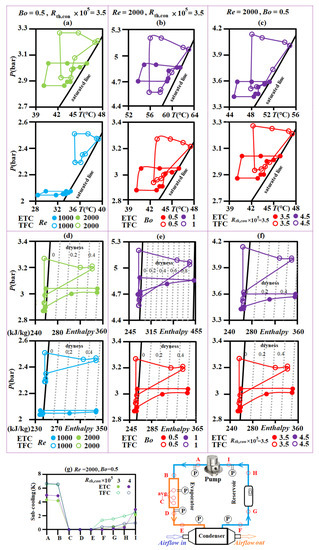 Thermodynamic cycles of the pumped thermosyphon loops with TFC and ETC in P-T and P-H diagrams for revealing the isolated impacts of (a,d) Re, (b,e) Bo (c,f) Rth,con. (g) sub-cooling temperatures along loops at Re = 2000, Bo = 0.5 with Rth,con = 4 × 10−5 and 3 × 10−5.