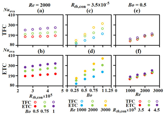 The changes of flow and vapor-liquid structures in the evaporator to respond the adjustments of Re, Bo, and, or, Rth,con result in the attendant Nueva variations. The different Peva and Teva,sat variations against Re, Bo, and Rth,con between the loops with TFC and ETC as typified by Figure 2 serve as the main physic to differentiate the vapor-liquid flow patterns and hence Nueva in the evaporators at a similar set of Re, Bo, and Rth,con. Figure 4 compares the variations of Nueva against (a,b) Rth,con at Re = 2000 (c,d) Bo at Rth,con = 3.5 × 10−5 (e,f) Re at Bo = 0.5 between the loops with TFC and ETC, respectively.