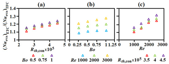 In Figure 5a–c, the ratios of Nueva between the loops with ETC and TFC are depicted to quantify the isolated Re, Bo, and Rth,con impacts on the Nueva for the ETC and TFC loops. Following the heat transfer results depicted in Figure 4, the ETC-to-TFC Nueva ratios are in the range of 1.09–1.35 for the entire Nueva data generated. By increasing Re, Bo, and, or, Rth,con, the ETC-to-TFC Nueva ratios are further elevated, indicating the enlarged pressure effect on the differential Nueva results between the loops with ETC and TFC.