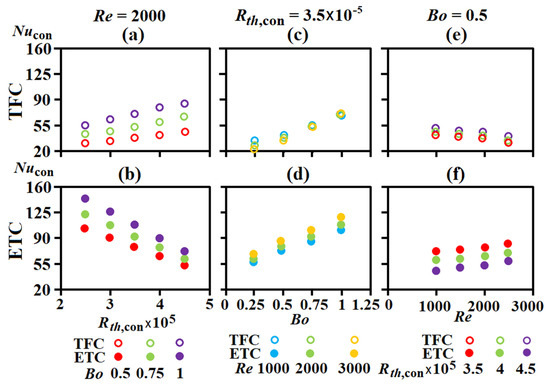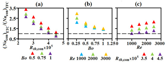 The various varying manners of Nucon against Rth,con, Bo, and Re as well as the differential Nucon levels between the loops with ETC and TFC resulted in the particular patterns of data trends in Figure 7a–c. While most of the Nucon ratios between the loops with ETC and TFC are above than one in Figure 7a–c, the decreased Nucon with Rth,con and the lesser ascending rate of Bo-driven Nucon increase for the loop with ETC resulted in the declined data trends in Figure 7a,b. Above all, the particular ETC configuration produced the higher Nucon than the TFC counterparts at most of the present test conditions with the ratios of (Nucon)ETC/(Nucon)TFC up to 3.39.