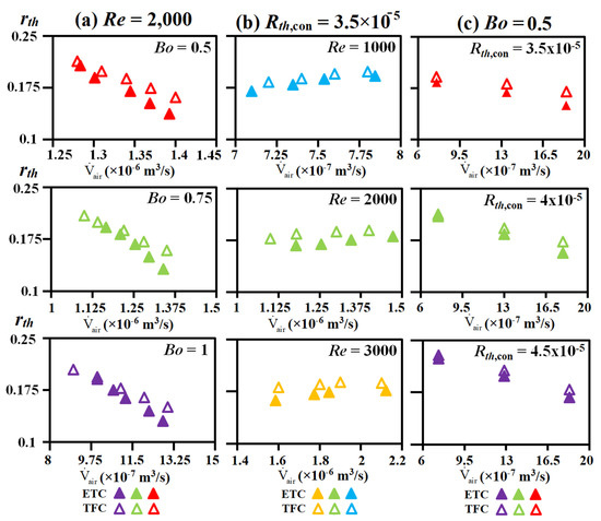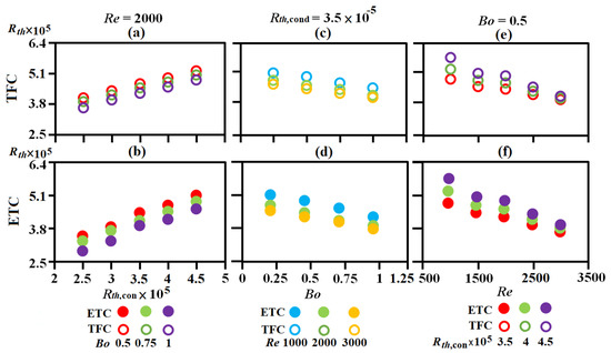 Following the manner constructing Figure 4, Figure 5, Figure 6 and Figure 7, the depictions of Rth variations against Rth,con, Bo, and Re in Figure 8a–f reveal the isolated Rth,con, Bo, and Re impacts on Rth for the loops with TFC and ETC. The effect caused by replacing TFC to ETC on the overall thermal resistance (Rth) featured the combined effects quantified by the ETC-to-TFC Nueva and Nucon ratios at the component level and the reduced Peva and Teva,sat at the system level. Figure 9a–c show the isolated effect of Rth,con, Bo, or Re on the ETC-to-TFC Rth ratio. As Rth is a reciprocal of the overall heat transfer index, the thermal performance improvement by replacing TFC to ETC at system level is affirmed when the ETC-to-TFC Rth ratio becomes less than unity with a lesser ratio for a higher degree of improvement. For both loops, the increase of cooling airflow rate to reduce Rth,con incurs the attendant Rth reduction in Figure 8a,b. As Nueva and Nucon for both loops are increased along with Bo, the Rth data in Figure 8c,d are consistently reduced by increasing Bo. While Nucon for the loop with TFC is decreased along with Re in Figure 6e, the beneficial Re effect on Nueva outweighs the Re-driven Nucon reduction to result in the decreasing trends of Rth in Figure 8e. For the lop with ETC, both Nueva and Nucon are elevated by increasing Re, leading to the Re-driven Rth reduction in Figure 9a. Referring to the ETC-to-TFC Rth ratios in Figure 9a–c, the increase of Bo, Re, or the cooling airflow rate for reducing Rth,con has led to the further reduction of ETC-to-TFC Rth ratio. Thus, the improvements of overall thermal performance caused by replacing TFC to ETC are amplified when Bo, Re, and/or the cooling airflow rate are increased. The ETC-to-TFC Rth ratios are found in the range of 0.81–0.99 at the present test conditions.