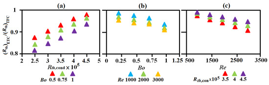 The ratio of Rth between the loops with ETC and TFC against (a) Re, (b) Bo, (c) Rth,con.