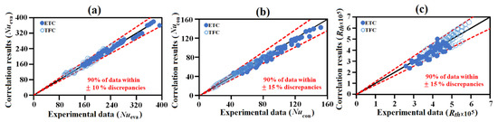 The developments of Nueva, Nucon, and Rth correlations are based on the data trends typified in the plots of Figure 4, Figure 5, Figure 6, Figure 7, Figure 8 and Figure 9. The depictions of Nueva and Nucon variations in Figure 4c,d and Figure 6c,d reveal a consistent linear-like increasing trend for the loops with ETC and TFC. Accordingly, all the Nueva and Nucon are fitted by a general linear function of Equation (13).