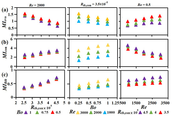 For each of the present pumped thermosyphon loops, the thermal performances parameters, namely Nueav, Nucon, and Rth and the various hydrothermal merit indices (MIs) were controlled by the dimensionless groups of Bo, Rth,cond, and Re, for a set of the predefined geometric and boundary conditions as expressed by Equation (1).